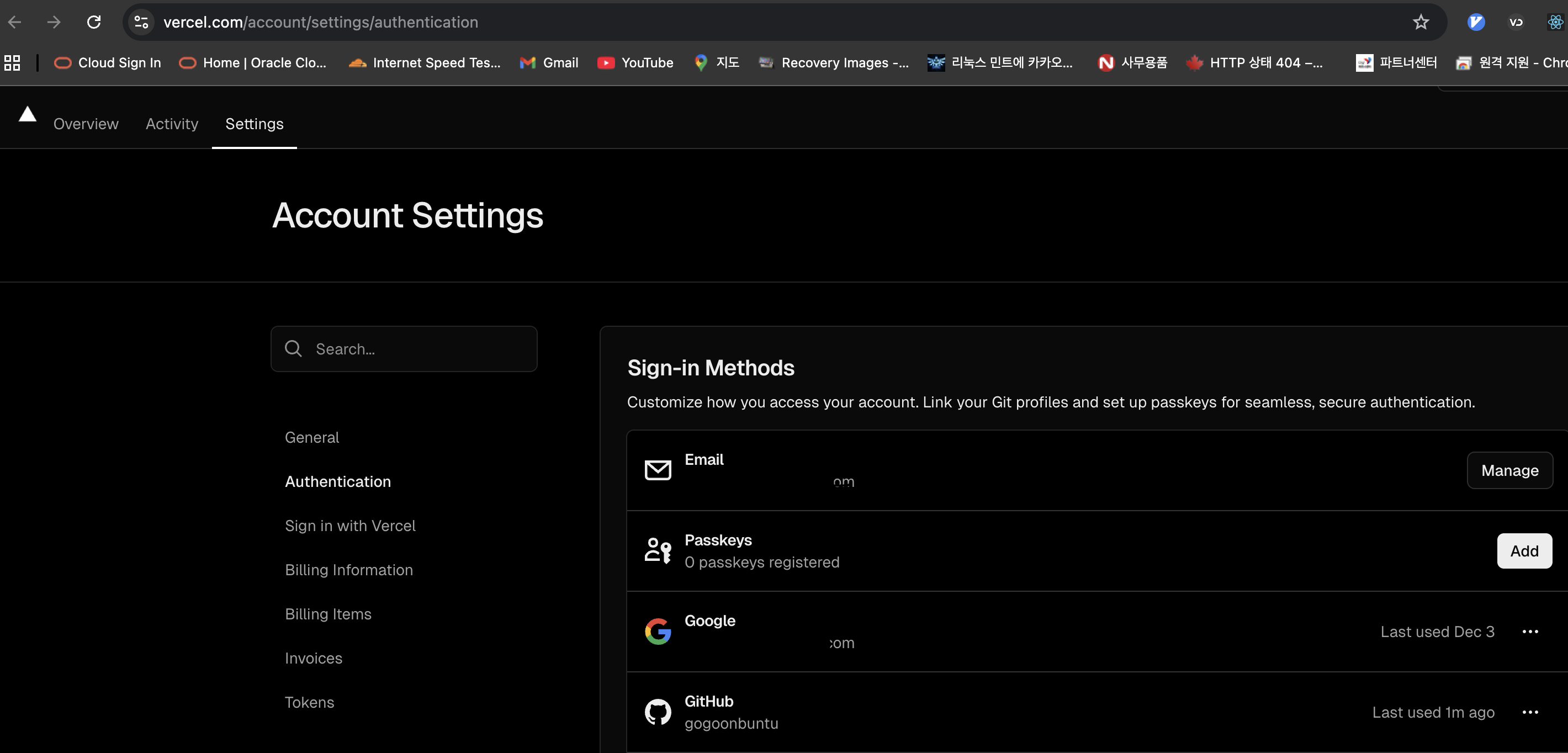 사진과 같이 vercel > settings > Account Settings 에서 로그인된 계정이 올바른지 확인하라.