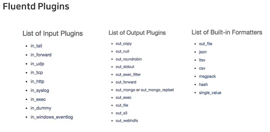 대표적인 3가지를 소개한다. (물론 3개 뿐 아니라 더 있다.) @tail 은 리눅스 명령어 tail 과 같은 의미로, 하위 속성인 path 에 지정된 파일의 = 로컬호스트의 파일 마지막부분 읽어오기 @http 는 curl 명령어 같이 http 요청으로 로그를 받는 플러그인이다. port와 bind @forward 는 보통 - [ 실제 로그가 찍히는 서비스 서버 ] 에 설치된 [ fluentd A ] 에서 로그를 보내고, [ 로그 수집하는 서버 ] 에 설치된 [ fluentd B ] 에서 로그를 수집할 때 [ 로그 수집하는 서버의 fluentd B ] 에서 사용하는 태그이다. 이런 작동을 포워딩(한글로 굳이 꼽자면 주선하다?)이라고 부르기도 해서 forward라고 이름지어진 듯 하다. |